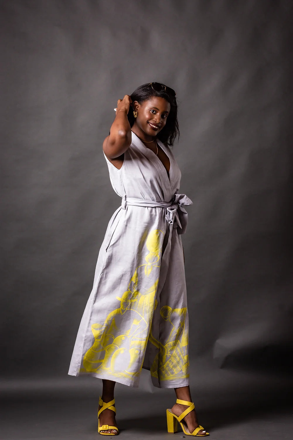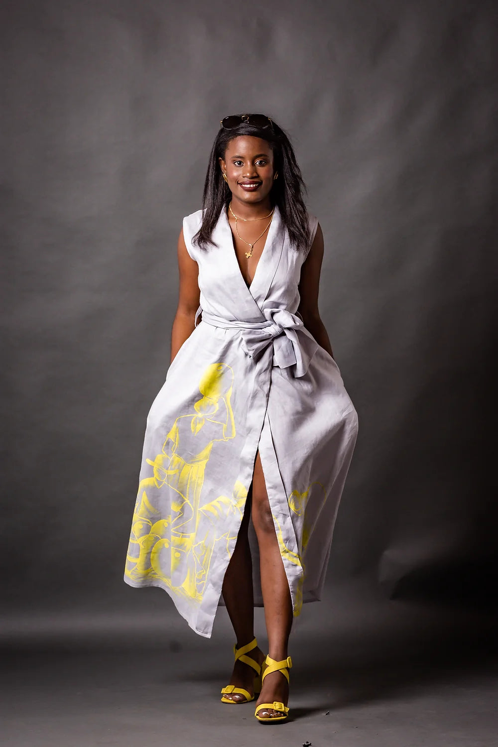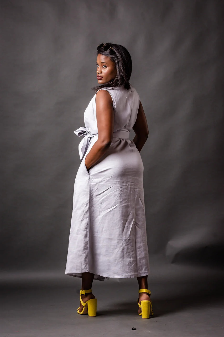 Wrap dress, sleeveless, Sash tie, with knot fastening, hem below knee….