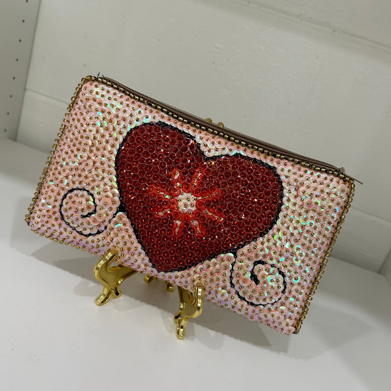 This vibrant beaded clutch features a heart-shaped design inspired by the Haitian Vodou vèvè for Erzulie, the spirit of love and beauty. The heart pattern in red is set against a shimmering light pink background, accented with black swirls. Framed by a gold-toned beaded border, this clutch combines traditional craftsmanship with modern flair, making it a unique and culturally rich accessory.